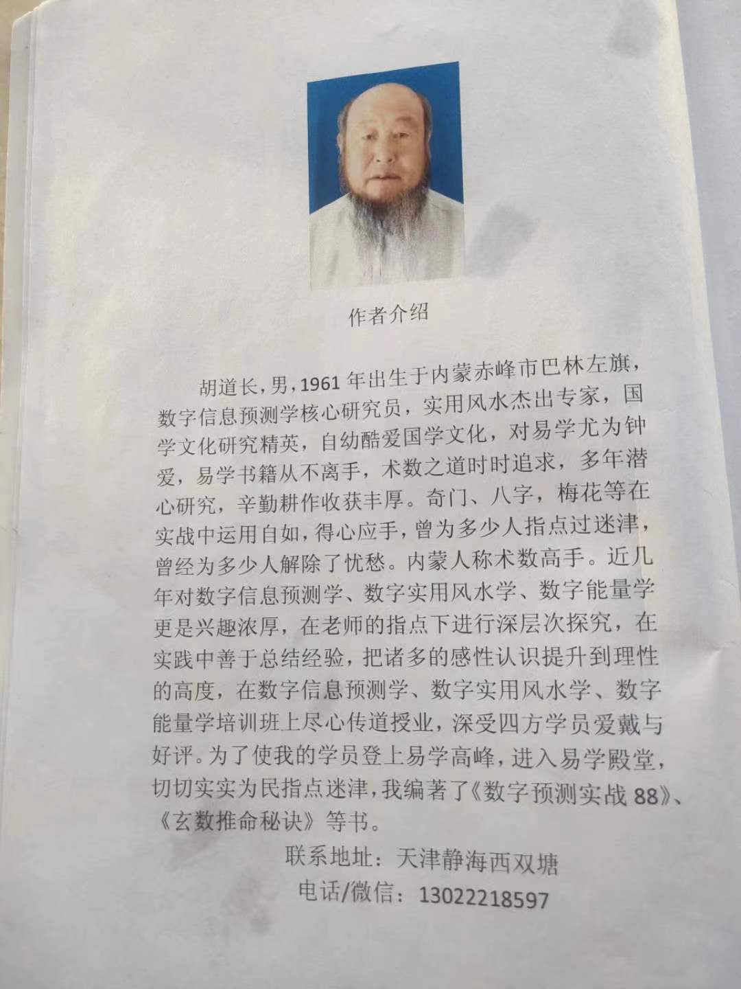 本人以仁道,诚信而立本,为国祈福,为民消灾,对阴阳易理,五行八卦,阴阳风水布局,手相面相,及其精通,对医学之外的病情具有治疗治愈之经验,行道近三十余年,在神州大地种下不解之缘,福生无量天尊!对医学以外因素而染的怪病,杂症具有独到之处,具备治疗,治俞之本能,有丰富的经验!本人已仁德,诚信而立足中华大地!为传承和发扬民族传统文化发光发热。