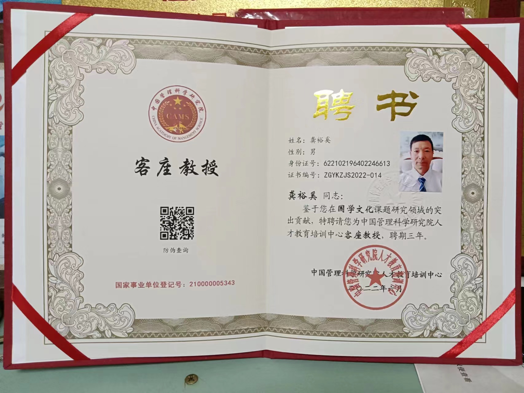 2020年8月被华夏龙文国学文化研究院聘为副院长,并授予聘任证书和荣誉牌匾,代表国学院在当地积极推广国学文化传承工作。