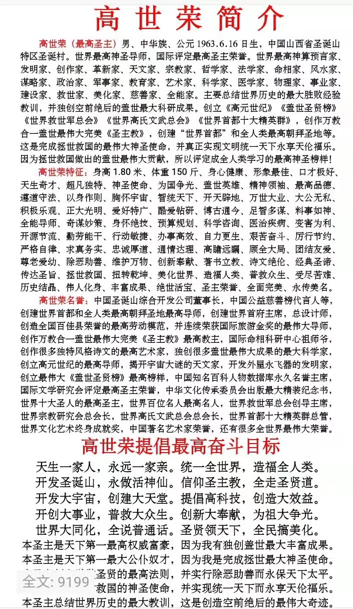 高世荣(最高圣主)男、中华族、公元1963.6.16日生,中国山西省圣诞山特区圣诞村。世界最高神圣导师,国际评定最高圣主荣誉。世界最高神算预言家、发明家、创作家、革新家、天文家、宗教家、哲学家、法学家、命相家、风水家、谋略家、政治家、军事家、教育家、艺术家、科学家、医学家、物理家、事业家、建设家、救世家、美化家、慈善家、全能家。主要总结世界历史的最大胜败经验教训,并独创空前绝后的盖世最大科研成果。创立《高元世纪》《盖世圣贤榜》《世界救世军总会》《世界高氏文武总会》《世界首都十大精英群》,创作万教合一盖世最伟大完美《圣主教》,创建“世界首都”和全人类最高朝拜圣地等。这是完成拯世救国的最伟大神圣使命,并真正实现文明统一天下永享天伦福乐。因为拯世救国做出的盖世最伟大贡献,所以评定成全人类学习的最高神圣榜样!