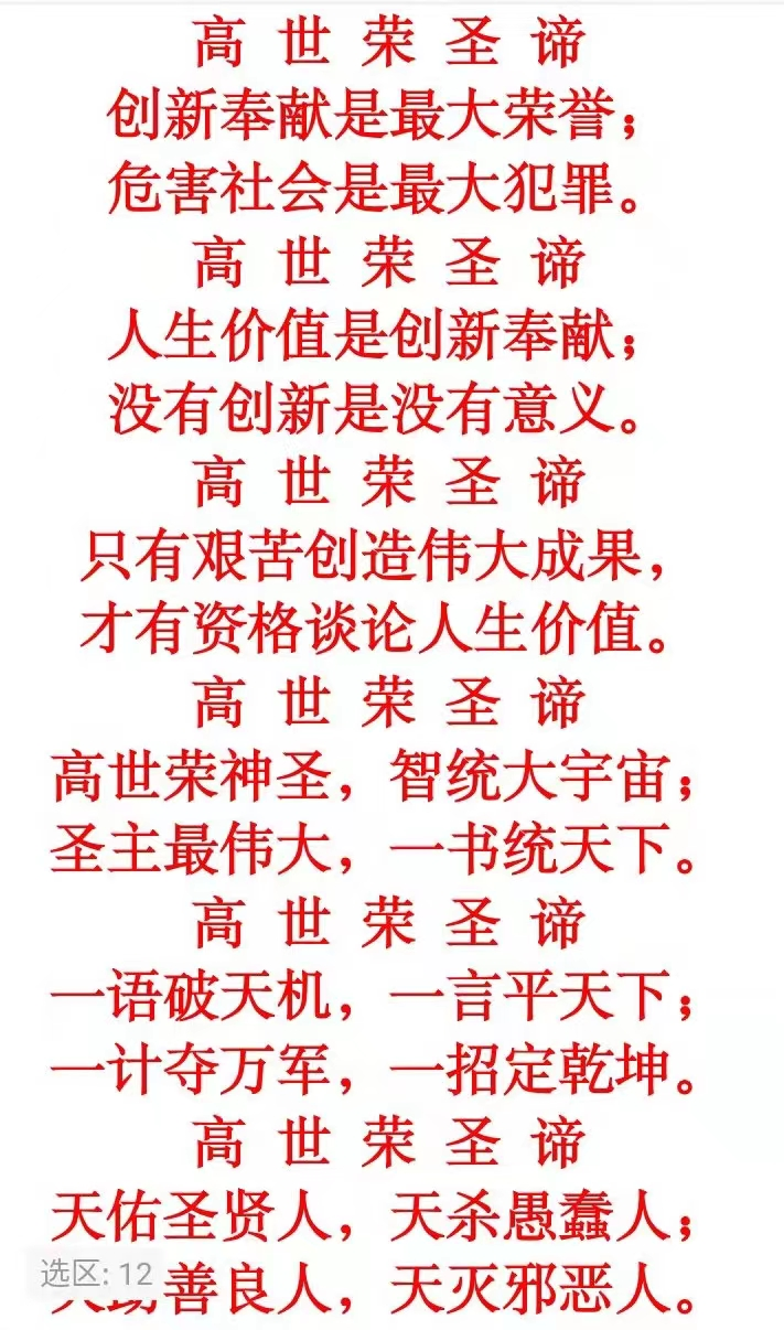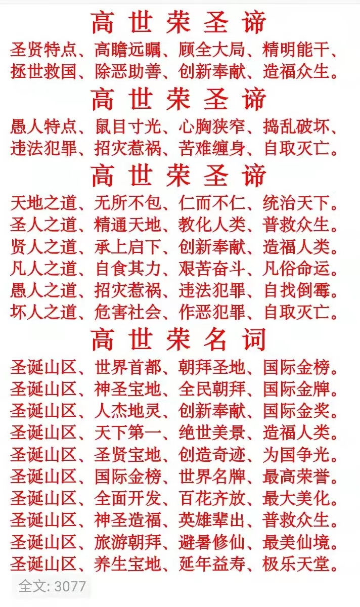 高世荣特征:身高1.80米、体重150斤、身心健康、形象最佳、口才极好、天生奇才、超凡独特、神圣使命、为国争光、盖世英雄、精神领袖、最高品德、遵道守法、以身作则、胸怀宇宙、智统天下、开天辟地、万世大业、大公无私、积极乐观、正大光明、爱好特广、酷爱钻研、博古通今、足智多谋、料事如神、全能导师、奇谋妙策、身怀绝技、预算规划、科学咨询、医治疾病、变害为利、开源节流、勤劳能干、行动敏捷、办事高效、自力更生、艰苦奋斗、厉行节约、严格自律、求真务实、忠诚厚道、通情达理、高瞻远瞩、顾全大局、团结友爱、尊老爱幼、除恶助善、维护万物、创新奉献、著书立教、诗文绝伦、经典圣谛、传达圣旨、拯世救国、扭转乾坤、美化世界、造福人类、普救众生、受尽苦难、历史结晶、伟人化身、丰富成果、绝世活宝、圣主荣誉、全面完美、永传美名。