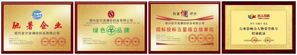 也正因如此,皮尔波澜在2011年就成为了全球纺织网、网上轻纺城的优质会员企业,经过多年的线上耕耘,获得了许多优秀的设计师资源,在线上揽得一大批稳定的客户,同时积极参加由全球纺织网、网上轻纺城联合举办的“布满全球”线下对接会,让皮尔波澜品牌走出国门,到访意大利、拉斯维加斯、美国纽约等地,在线下又得一批国内外客户。经过不懈的努力,皮尔波澜获得了质量服务信誉AAA级单位、浙江省重质量守诚信优秀示范单位、公众满意放心单位、诚信服务优秀单位等多项荣誉,力尚于本人也作为全球民族品牌推广大使、中国诚信优秀企业家、中国管理科学研究院高级研究员相遇业内,他的事迹一度登上央视频道、《晋商文化》。要说力尚于的成功,除了赶上了纺织业发展的大好时机,更是离不开他自己的勤奋努力和这种具备长远眼光的超前意识。