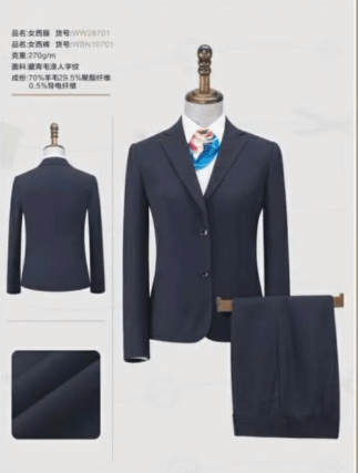 涤纶,即聚酯纤维,是目前市面上合成纤维的首要品种,其最优之处在于良好的抗皱性和保形性,具有比较高的韧性与弹性恢复能力,结实耐用、抗皱免烫、不易粘毛其;羊粘毛,采用天然羊毛利用羊毛的缩绒特性经机器加工粘合而成;高支纯毛,即支数非常高的纯毛面料,反映了毛织品工艺性细度;毛涤面料,指的是羊毛和涤纶混纺纱线制成的织物,既可保持羊毛的优点,又能发挥涤纶的长处;板丝呢是用颜色一深一浅的两种原料,按1:1比例排列采用经纬编织而成;贡丝锦是针对毛料服饰面料织造工艺的一种叫法,其最直观的感受是从表面看上去呈麻网状,因表面采用平纹结构,反面采用细腻的直贡斜纹,面料结构紧致,制作成衣后,质感细腻、挺括性好、耐磨抗皱。