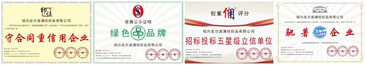 绍兴皮尔波澜纺织品有限公司专注于生产精纺面料,主要有涤纶、羊粘毛、高支纯毛、毛涤、板丝呢、贡丝锦和哔叽等。
